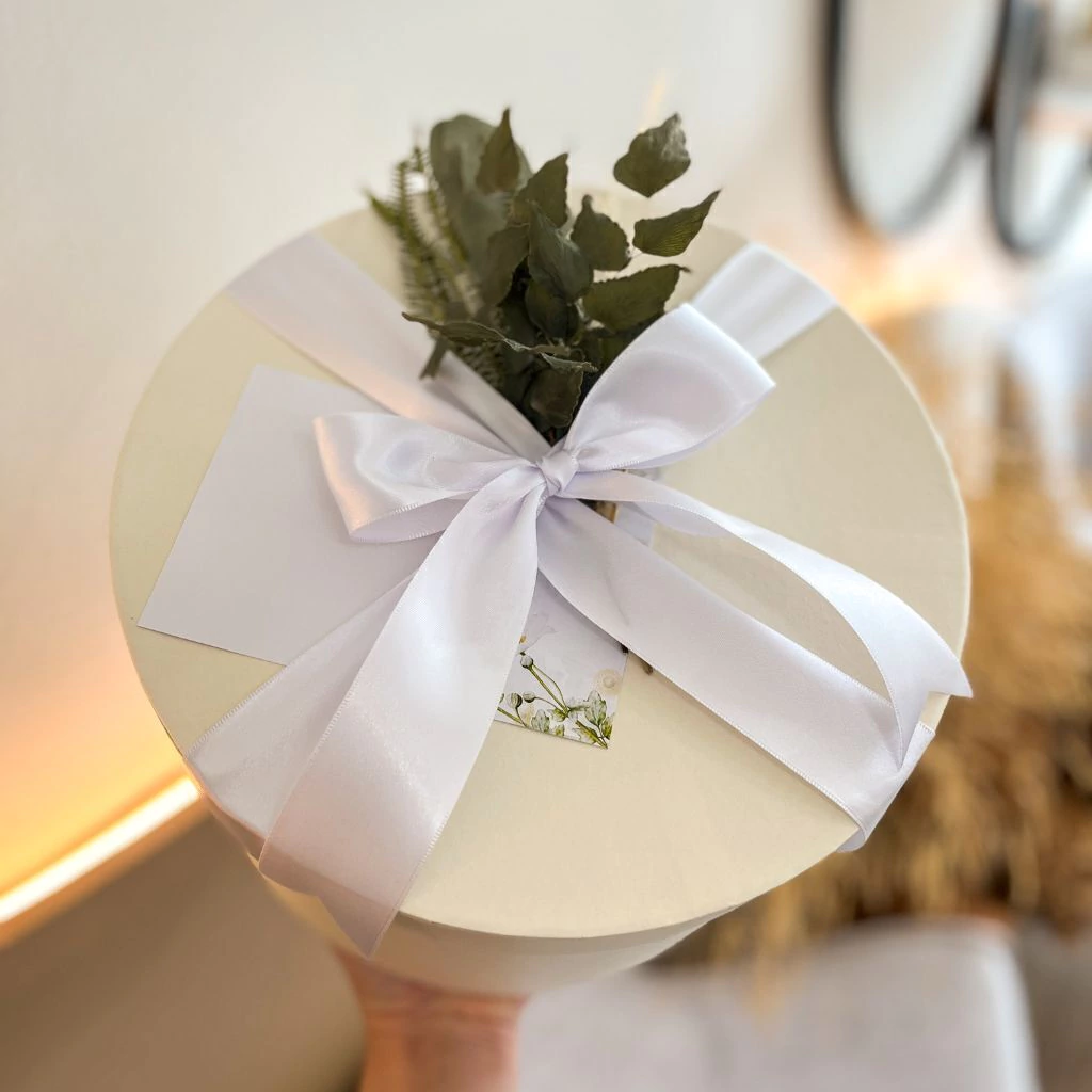 - Box redonda para presente 14x18 de diâmetro forrada com palha fininha para acomodar os produtos e laço de cetim